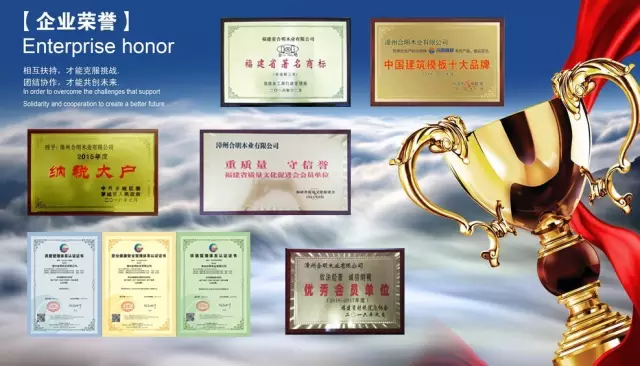 2016年,合明是收获的一年!20年来合明兢兢业业经营,厚积了行业内外的一致好评。今年,合明获得了福建省工商局颁发的福建省著名商标,漳州市政府颁发的纳税大户(连续3年获得)、通过3大国际标准体系认证、福建省财税协会颁发的依法经营、诚信纳税单位、福建省重质量守信誉企业,被福建日报评为“2016年度福建经济质量信誉海西十佳品牌企业”,木业网网评“中国十大覆膜板品牌”等等荣誉。