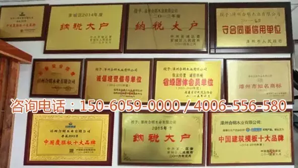 合明模板获得“纳税大户”、“质量安全信誉”单位、“诚信经营倡导”、著名品牌、建筑模板十大品牌等众多荣誉称号。
