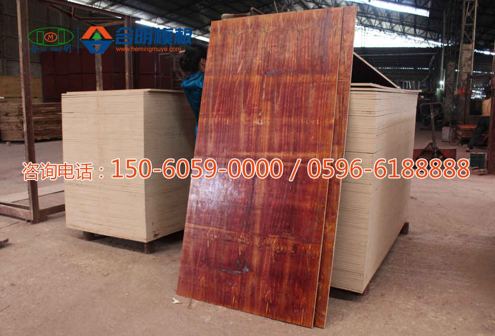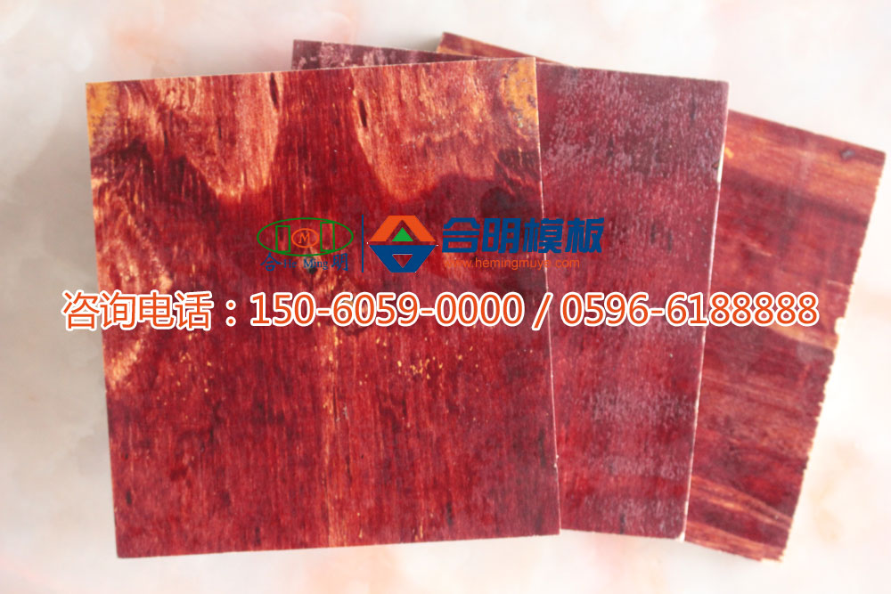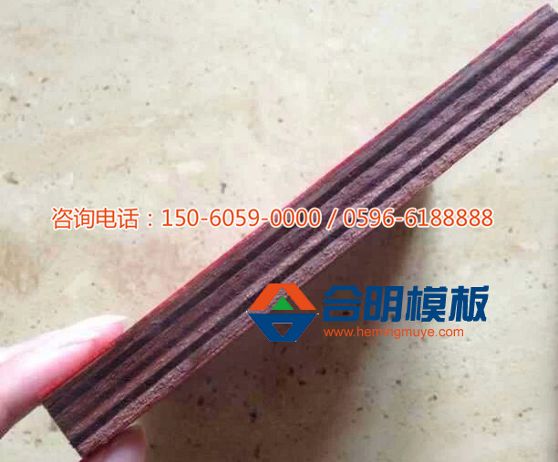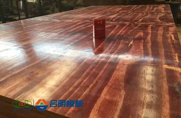 与其他种类模板不同的是,合明苯酚板除了芯板滚足酚醛胶,上下面板也各滚一层足量的酚醛胶,这层酚醛胶是合明胶水厂特制胶水,比其他三聚氰胺胶和脲胶胶性更强,防水防腐,在混泥土和模板中间起到隔阂作用,防止泥沙雨水侵入保护模板,使模板更耐用。