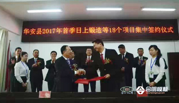 近日,合明模板与漳州华安县政府举行首季项目签约仪式。合明模板签约投资的亿元级项目,主要用于扩厂投建节能环保新型材料领域,是华安县政府重点引进关注项目。