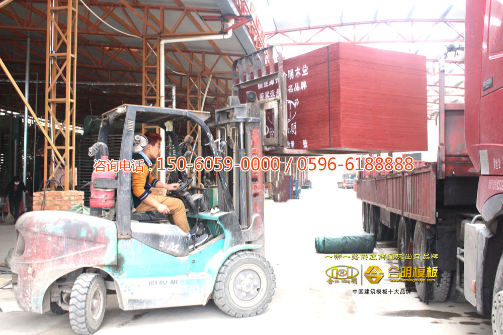 物流部早已准备好出货单,跟仓库进行对接,十几辆铲车有条不紊地把模板从仓库运送至挂车上,挂车上的装货师傅跟铲车司机默契合作,将合明模板整整齐齐地叠放在挂车上,盖上塑料防水膜,牢牢地绑上绳子,确保运输过程安全。