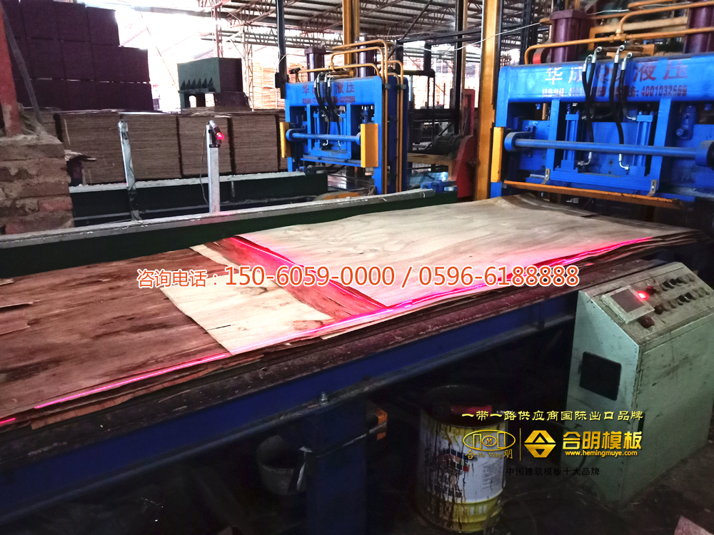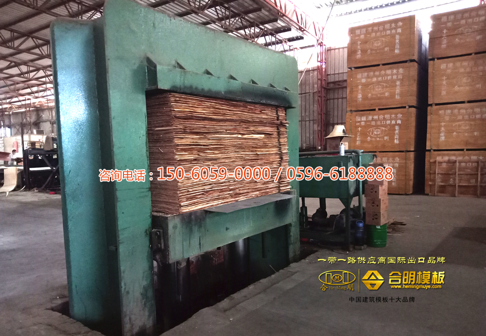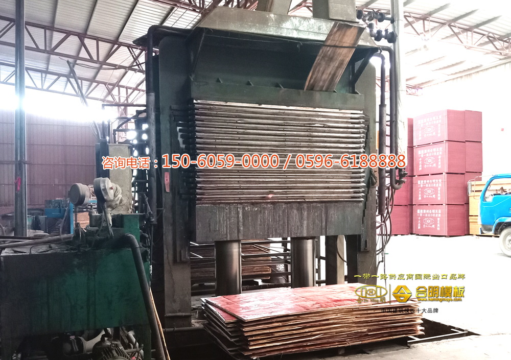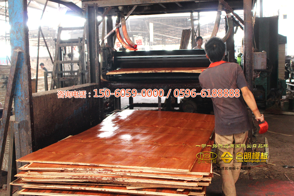 滚好面胶或者覆好膜的板,用热压机进行热压。合明热压机是新型热压机,可根据不同种类模板进行各种高温热压,热压时间长,小板900秒大板1400秒,一般覆膜板130度以上热压,高脂覆膜板150度高温热压,热压好的模板最多可周转38次。