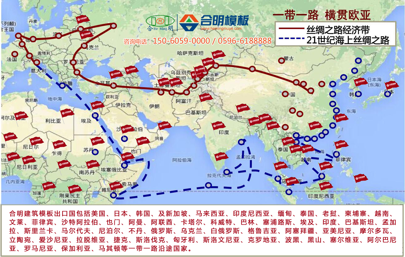 得力于国家一带一路政策,合明已同海外40多个国家和地区的工地建立稳定合作关系。由于合明模板品质稳定,得到很多中国模板经销商、工程建设单位的赞许,于是他们在海外的工程项目也越来越多要求使用合明模板。