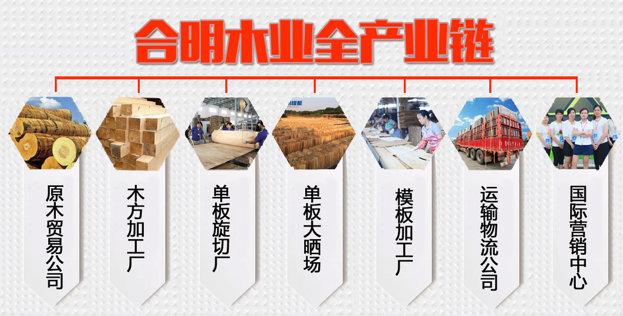 合明木业集产供销为一体,除了模板生产外,旗下还有营销中心、国际事业部、物流园、原木贸易公司、原木旋切厂、晒板场、方木加工厂等建筑模板生产附属机构,踏实稳步经营,形成从原材料采购到建筑模板、建筑方木生产、出售全产业链大型企业。
