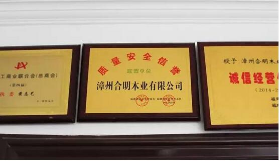 合明木业讲究产品质量,重视生产安全,诚信经营,获得荣誉