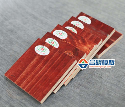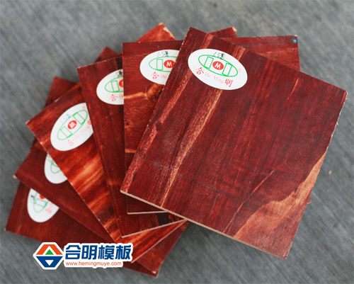 与其他种类模板不同的是,合明苯酚板除了芯板滚足酚醛胶,上下面板也各滚一层足量的酚醛胶,这层酚醛胶是合明胶水厂特制胶水,比其他三聚氰胺胶和脲胶胶性更强,防水防腐,在混泥土和模板中间起到隔阂作用,防止泥沙雨水侵入保护模板,使模板更耐用。