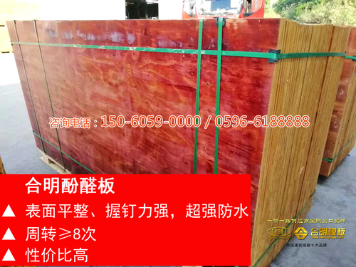 在模板品类上,合明木业顺应市场需求,不断研发新产品,产品从单一的红板到现在的红板、酚醛板、覆膜板、覆塑板多种类多规格系列建筑模板。每天源源不断生产松木、桉木等多材质、多规格的建筑模板。合明注重产品质量,纯海外购进松木为原料制成的模板及新型木塑结合建筑模板周转次数达30次以上,高温煮水5个小时不开胶。